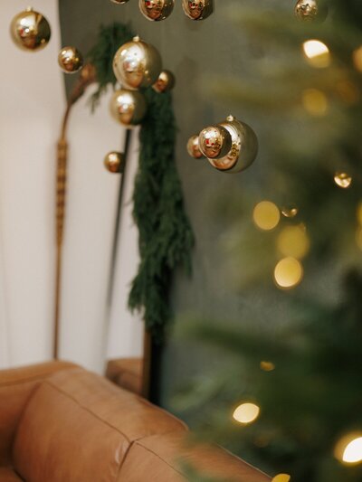 A warm and inviting scene with a luxe leather couch, golden tones, and soft holiday accents. The perfect spot to cuddle up as a family and capture the season’s glow.