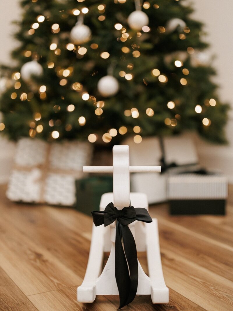 A classic, elegant space with twinkling lights, decorated trees, and a cozy holiday feel. Perfect for dressed-up family portraits that will look stunning on your holiday cards.